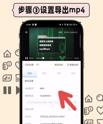 4、记录iphone的编码与分辨率,再进行视频转换参数设置,视频格式选择MP4;