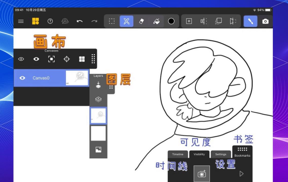 除了左上角的菜单,app 的界面可以分成了三个区域:画布区、编辑区与动画区。
