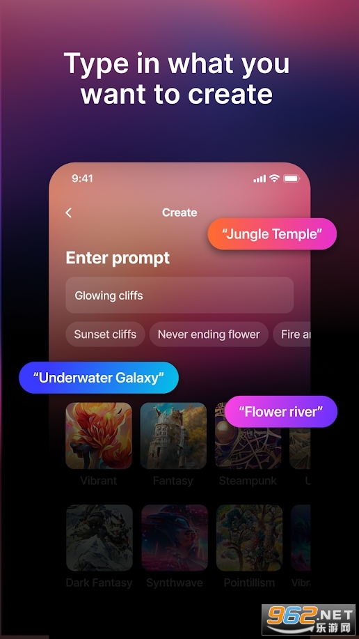 3.WOMBO梦想将艺术扩展到大众。你不需要画笔、铅笔或任何艺术用品来制作漂亮的艺术品,你所需要的只是一个想法。退后一步,让WOMBO梦想成为你作品的画笔。