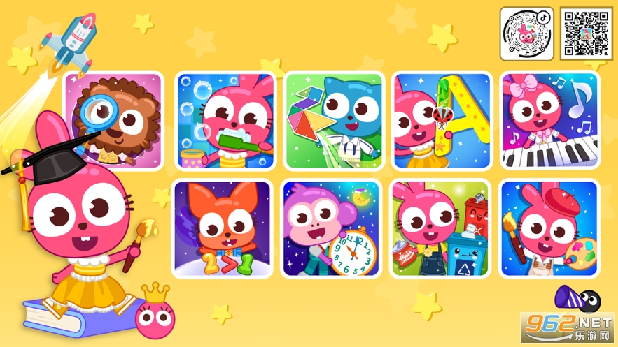 2、泡泡兔的家六大模块进行分类,可以自由的探索启蒙语言、逻辑思维、情商艺术、生活习惯等多种类型的互动游戏;