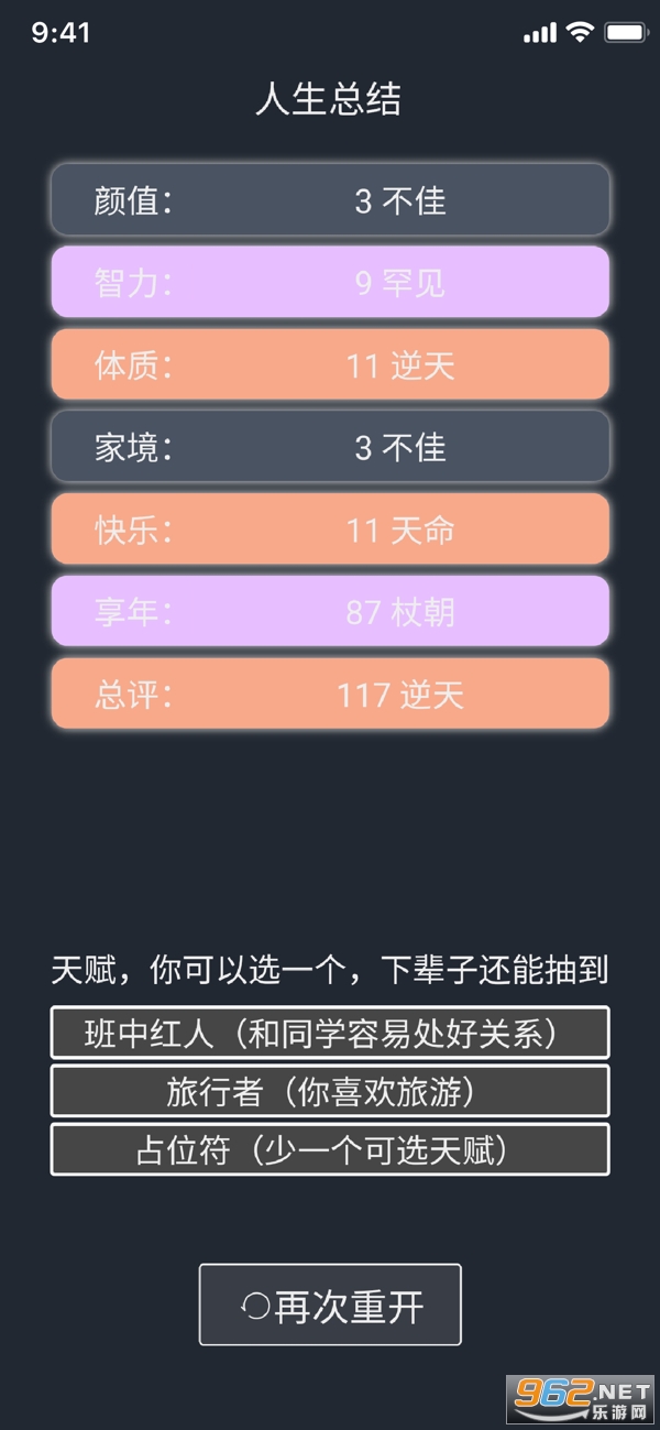 1、无限重开,自由选择人生属性,自己的天赋和智力由你决定;