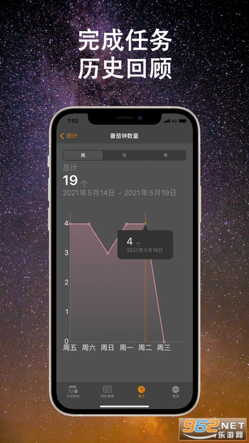 按照周,月,年三个维度的时间区间去回顾你的番茄时钟记录,你可以查看番茄的数量,总时间和完成的任务数量以获知你在一个时间段里的学习和工作状态,最重要的是你可以查看中断次数和原因以排除以后会打扰你专注的因素,这一切都是为了帮助你养成更加专注和高效的习惯。