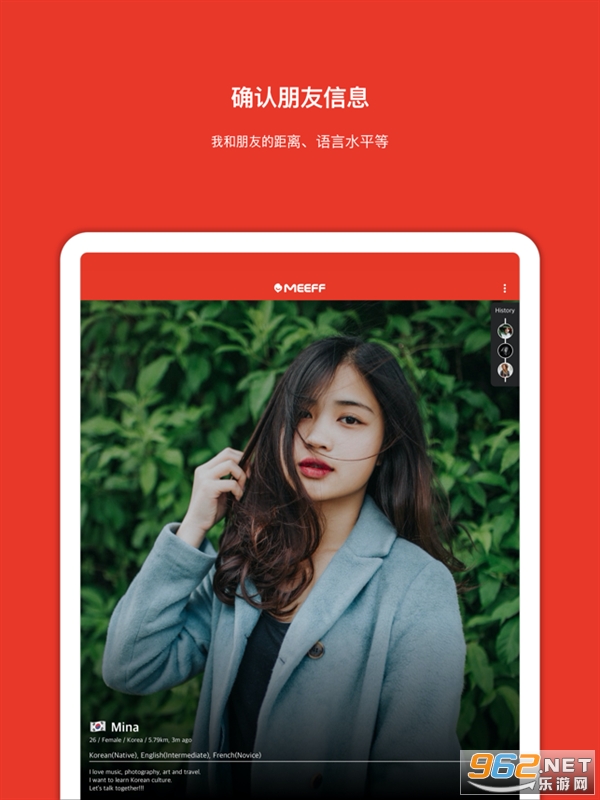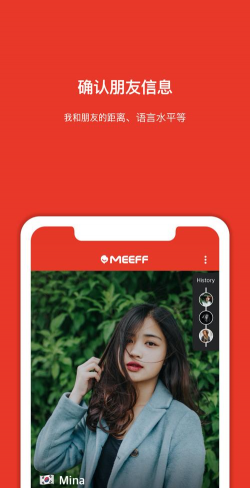 《meeff软件》是一款非常好用的软件,轻松的交到很多外国朋友,目前有很多的韩国人在使用。通过软件进行结识交流,聊聊爱好和生活,还能够够自己设定距离,能够对语言进行翻译,让你们没有障碍的沟通。喜欢交朋友的话就快来试试吧!
