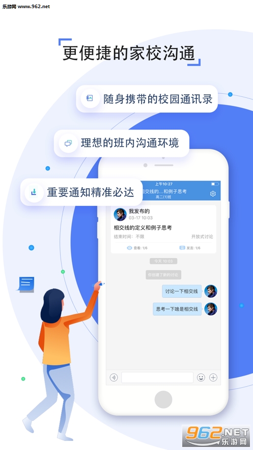 4、多方沟通:教师、家长可快速创建备课组、育儿组等,围绕教学、教育实时交流;还可随时随地进行班级圈分享、互动,孩子在家与校穿梭时的学习和生活状况尽收眼底。