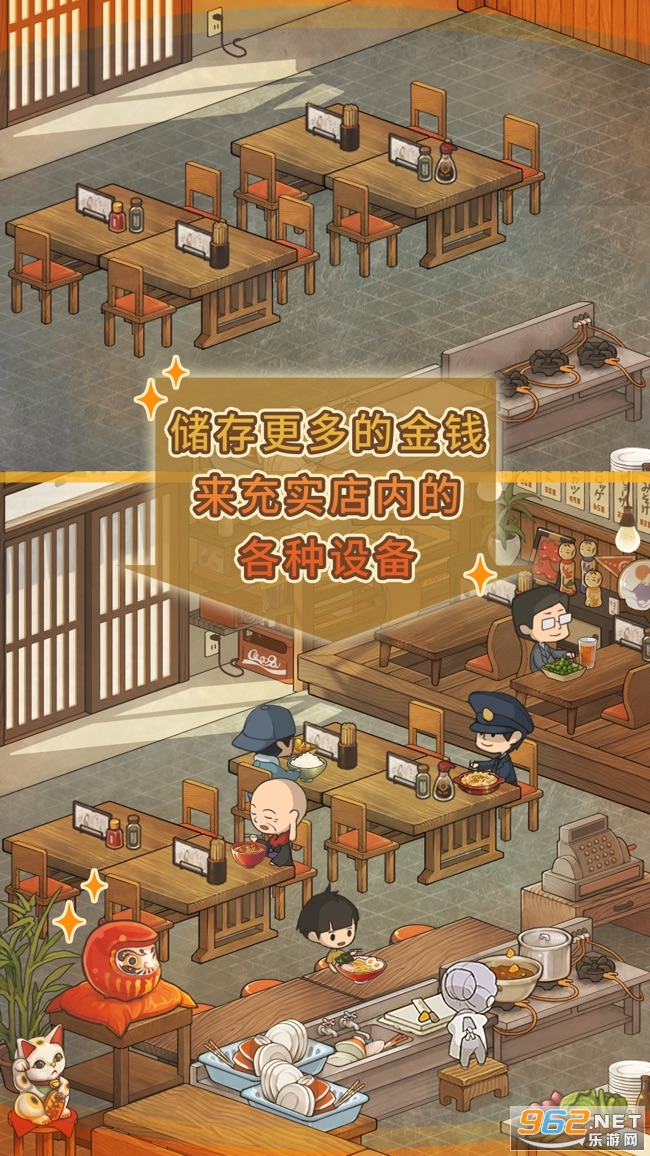 3.你可以通过不断的经营商铺来提升自己的财富,装饰你的食堂,让它们更加的光鲜亮丽。