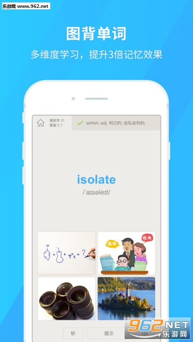 《百词斩》是款十分特别的软件,它用单词配以精挑细选的轻松搞笑图片来提升使用者对单词的印象,或许《百词斩》并无法完成传统的单词背诵任务,但其对于扩展词汇量非常有用。《百词斩》还拥有其他平台版本,甚至包括,不过他们只做一件事,就是一个单词配一张图,让你记住。