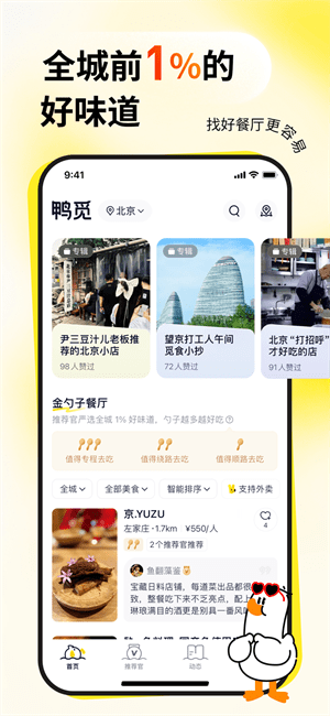 约占北京餐厅的0.1%,是鸭觅的推荐官们大都给予高评价的餐厅。