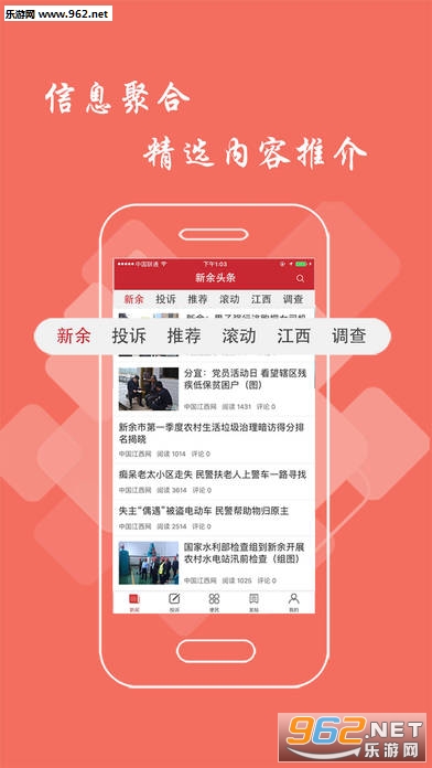 新余头条APP,是基于大数据统计汇集地方性新闻内容,包括头条、问政、连线、论坛等几个频道,里面的资讯实时更新,并能根据用户社交行为、阅读行为、地理位置、职业、年龄等挖掘出兴趣并推送对口新闻资讯。