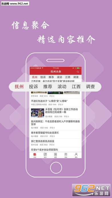 抚州头条APP,是基于大数据统计汇集地方性新闻内容,包括头条、问政、连线、论坛等几个频道,里面的资讯实时更新,并能根据用户社交行为、阅读行为、地理位置、职业、年龄等挖掘出兴趣并推送对口新闻资讯。