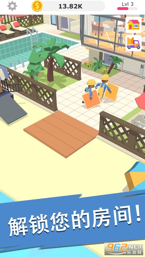 在这个轻松休闲的装修游戏中,你只需要打开游戏界面,工人们就会不断为你装修房屋哦!你的目标只有一个而且很简单:完成装修漂亮的房屋!