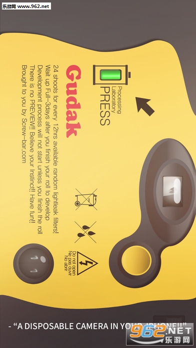 《Gudak Cam苹果中文版》是一款非常有格调的怀旧风胶卷相机软件,让你的手机变成古老的胶卷式相机,每天只能拍摄24张照片,取景界面也都是按照老式相机的模式来,怀旧感十足,喜欢玩各种相机,学习摄影的朋友们,可以下载Gudak Cam ios汉化版试试。