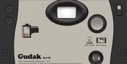 在Gudak Cam中,软件一次只提供一卷胶片,可以拍摄24张照片。在拍摄时,通过特别的取景器进行取景和构图,每次拍摄完一卷照片,软件都会将照片放入到专门的相册里进行处理。从Gudak Cam的拍摄取景形式来看,很像Hipstamatic的复古拍摄模式,不同的是,Hipstamatic可以放大取景框,可以选择镜头和胶片,而Gudak取景框很小不能放大,并且仅有一种柯达胶卷色彩风格。