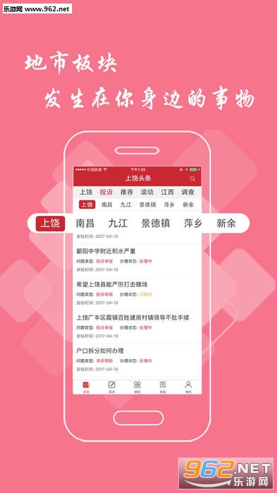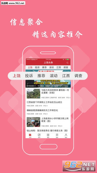 上饶头条APP,是基于大数据统计汇集地方性新闻内容,包括头条、问政、连线、论坛等几个频道,里面的资讯实时更新,并能根据用户社交行为、阅读行为、地理位置、职业、年龄等挖掘出兴趣并推送对口新闻资讯。