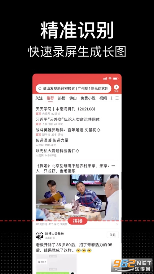 精准识别:一键操作录屏,智能拼接算法快速生成长图。