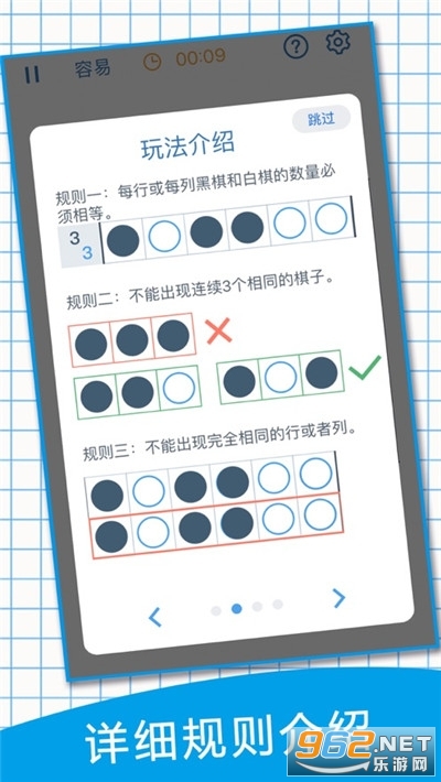 每道题都是由一个网格组成,不同的难度对应的网格不同,网格中放置了黑棋和白棋,游戏目的就是将网格填满,并满足以下三条需求: