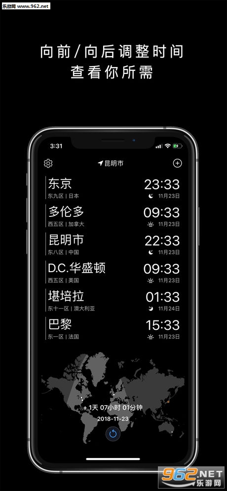 4、在查看未来或过去时差方面,在世界地图上左右滑动,就能直接拨快或拨慢当地时间,列表中的所有城市时间都会同步变化,查看未来时间的各地时差,非常方便。