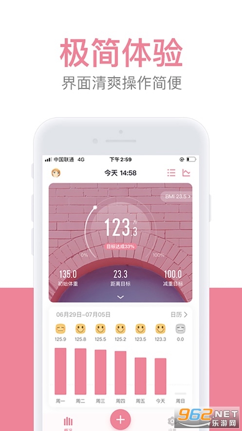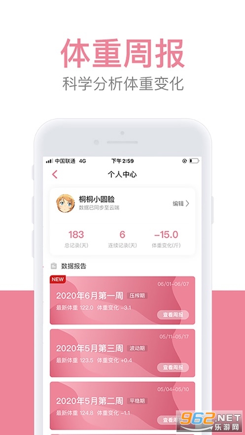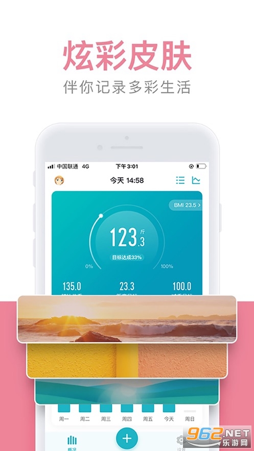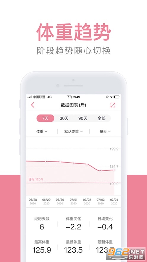 2、体重列表、柱形图、趋势线、百分比圆环等多种方式为您展示减肥进展