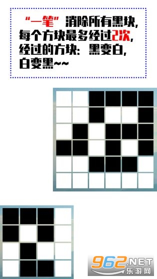 《一笔消游戏》是一款一笔画消除小游戏,游戏的画面非常的简约,看起来就像是围棋,游戏中玩家只能画一笔,将格子里面所有的黑色方块连接起来,不能重复经过同一个地方,这样才能消除黑色的方块,成功过关。