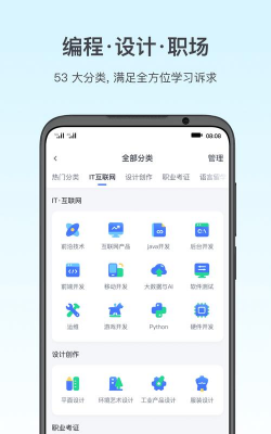 大量的课程,包括平面设计、摄影、游戏开发、美妆、网页设计、英语、公务员、财会、韩语、考研、投资理财、婚恋、亲子等等