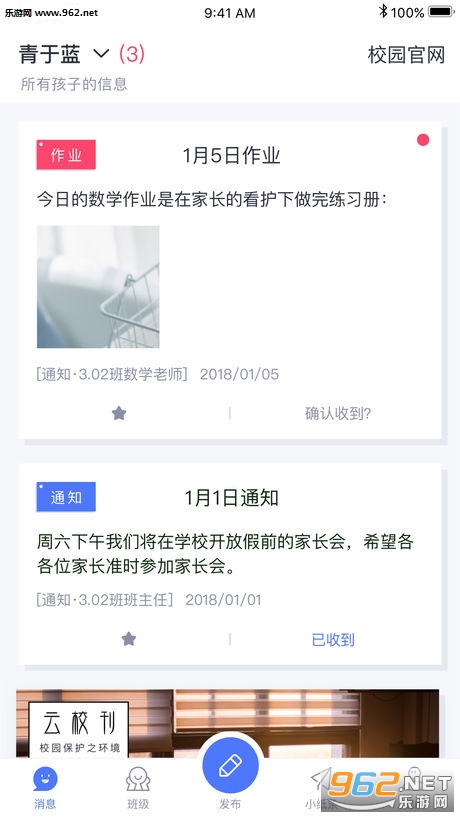 青于蓝app集班级通知、课程表、成绩下发、班级文件存储、个人成长相册、钱包、班级刊物(即《云板报》)、校级刊物(即《云校刊》)等功能为一体,为学校、老师、家长和孩子提供一个更便捷、更畅达的信息沟通、资讯分享和校园支付平台。