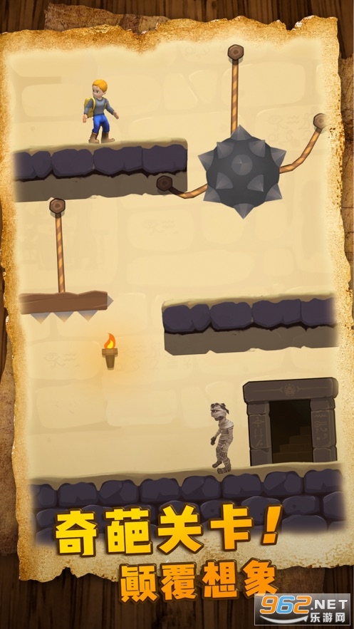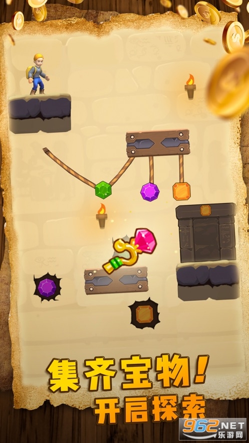 《神庙大冒险手游》是一款有趣的神庙风格的割绳子闯关游戏,游戏中小小的人质被绳子吊在空中,神庙中还有很多的机关陷阱,你要思考割断绳子的顺序,让那些机关自己互相破坏,成功解救小人,游戏的关卡有很多,可以慢慢挑战。