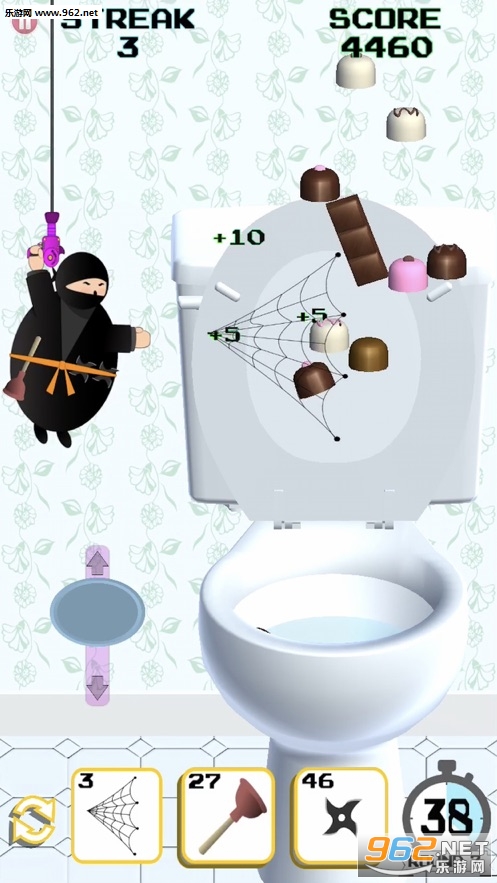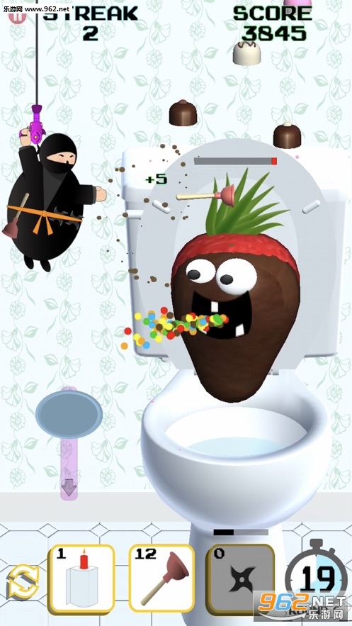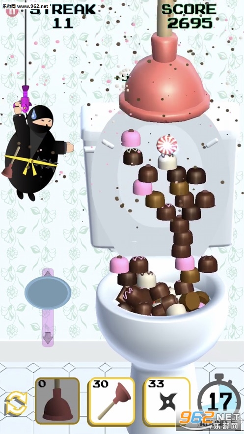 Toilet Ninjas是一款忍者题材的闯关游戏,游戏中玩家将操控一个胖胖的忍者,使用各种道具,清理堵塞的厕所,玩家的时间非常有限,需要以最快的速度在一分钟内清理所有堵塞的厕所。