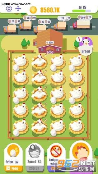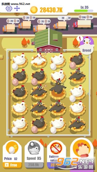 一款非常休闲的放置经营类游戏。在游戏中玩家需要合理的经营自己的鸡厂,在其中不断的养育不同的母鸡并完成所有的订单任务来活动金币。使用不同方式的研究来获得新品种让自己的鸡厂能够有更多的不同种类。