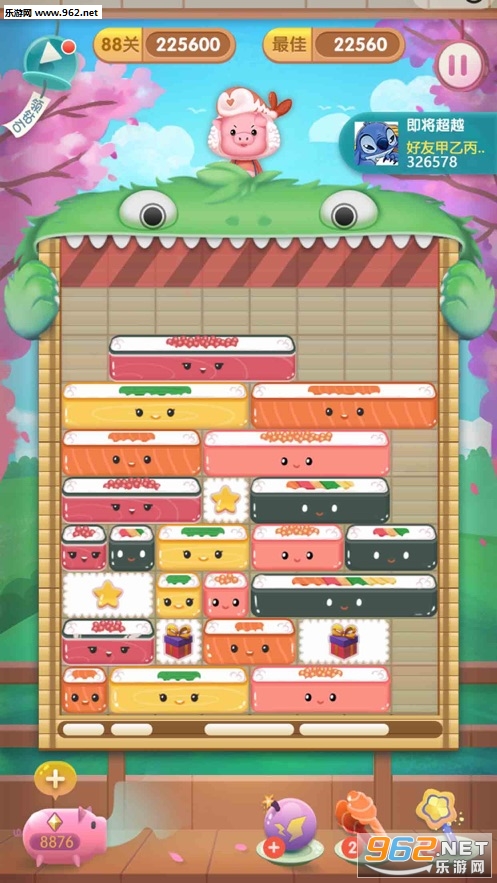 和可爱的小猪一起守护寿司吧!保卫这些美味的食物不要落入怪兽的肚子里,趁着寿司还离怪兽有一段距离,赶快把它们消除的一干二净,如果怪兽把寿司都吃光了,小猪就要饿肚子啦。
