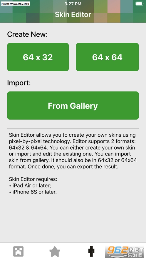 皮肤编辑器允许您使用逐像素技术创建自己的皮肤。 编辑器支持2种格式:64x32和64x64。 您可以创建自己的皮肤,也可以导入和编辑现有皮肤。 您可以从图库中导入皮肤。 它还应为64x32或64x64格式。 完成后,您可以导出结果。