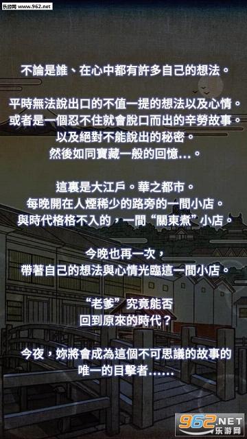因为某种原因而穿越时空来到了一个陌生的年代、让自己成为一个关东煮小店的顽固老爹并经营这间关东煮小店的、故事推进式休閒放置型游戏。