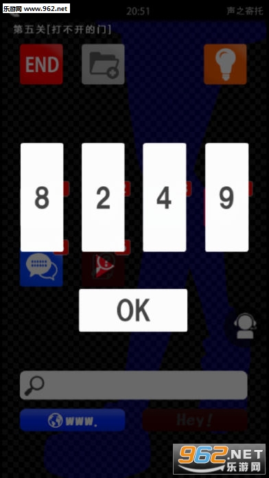 第四关,医院大厅: 调查大厅柜台,发现纸条,上面写“解放病人”,然后和两米长的梯子互动,得知我们需要四位密码。然后点最后一个语音(我记得是),就可以获得关键字“回去”。然后在搜索条里是回去的条件下点击“HEY!”,回到手术室。(重点来了!做好笔记)这里需要把搜索条内的关键字换成“酒精”,然后再和充气娃娃互动,然后娃娃肚子上有密码出现。接着回大厅,用密码和梯子互动,进入下一关。