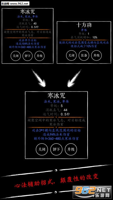 招式的效果并非固定,可以搭配多个心法变得更强甚至转换成相反的属性,千变万化而不穷。道友可以自由组合招式和心法,如何才是最强搭配,由你决定!