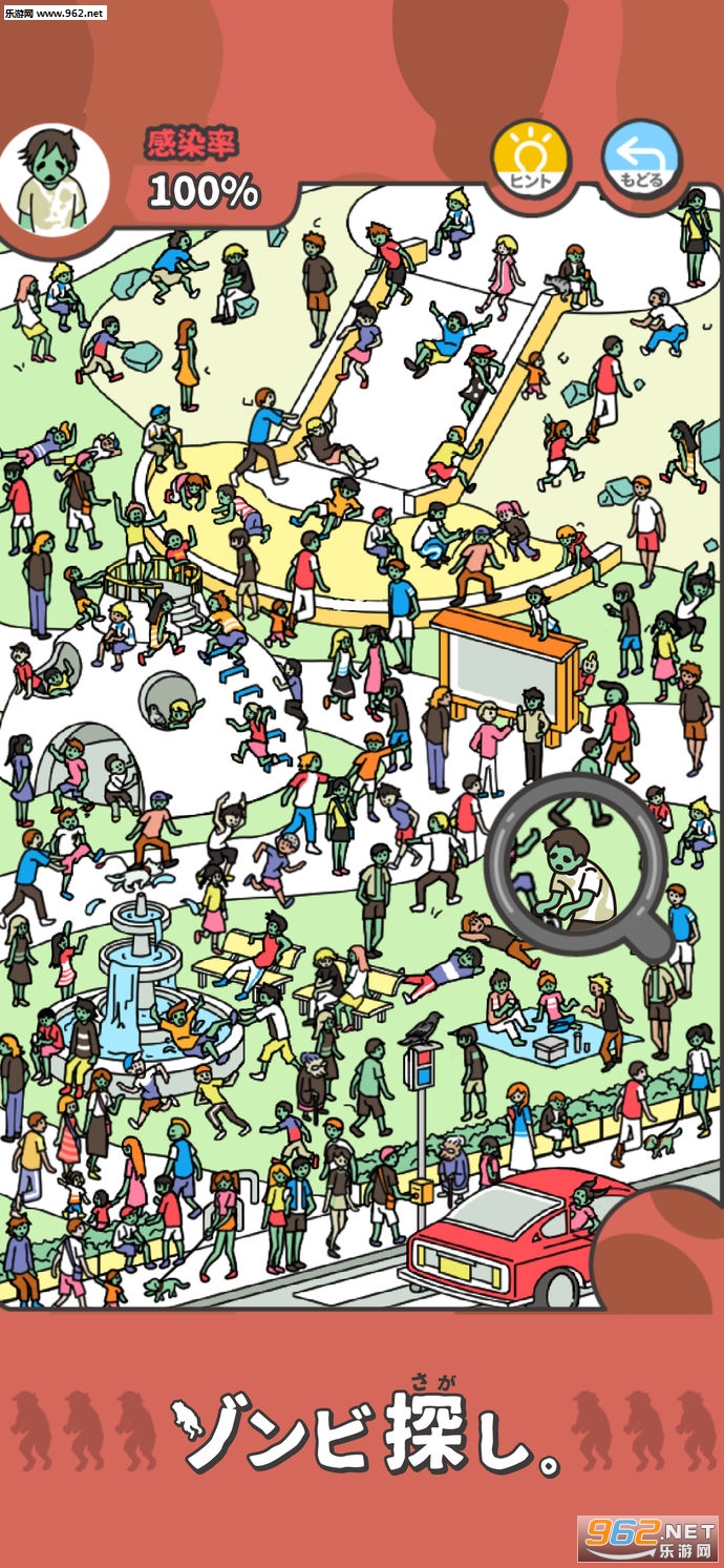 这是一款简单的类似于找茬的游戏,在游戏的设定中,僵尸和人类生活在一起,图像中的人物的模型都很小,玩家需要利用游戏中的放大镜去找寻僵尸,把他们找出来,为了增加难度,你需要在僵尸把所有人感染之前抓到他们,而且僵尸也是会不停的进行感染的哦,和时间在赛跑,喜欢的亲们赶紧下载吧。