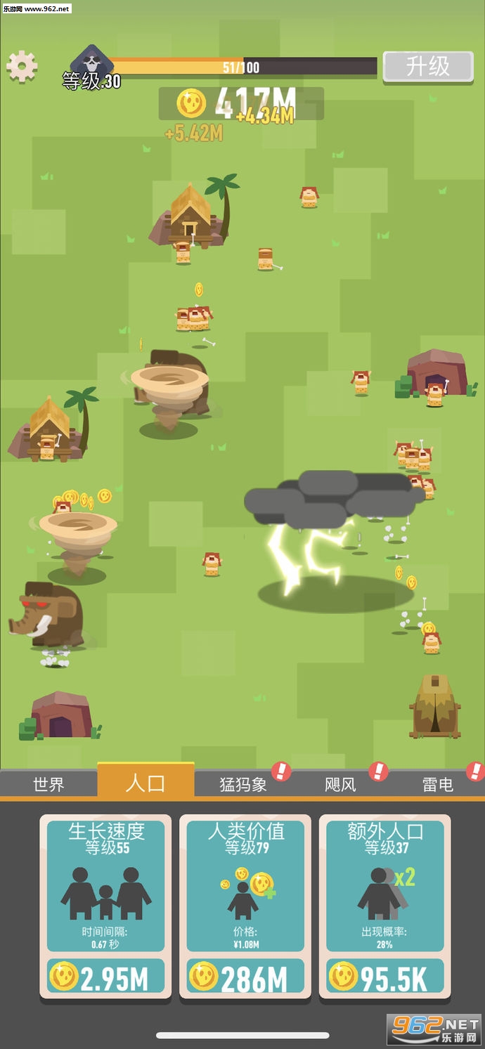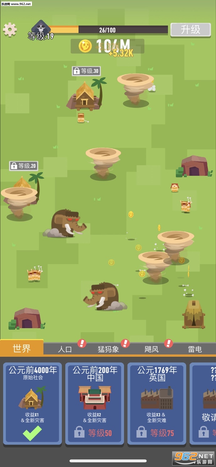 选择时代并摧毁它,摧毁人类社会可以获得金币,用来升级你的灾难,如果你嫌人类不够还可以发展人类社会,让人类的文明进一步发展,人类价值提高,人口加速生长,然后……摧毁它!