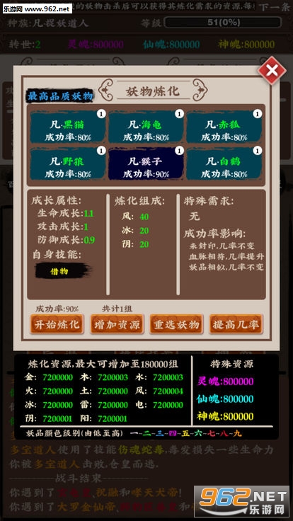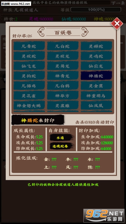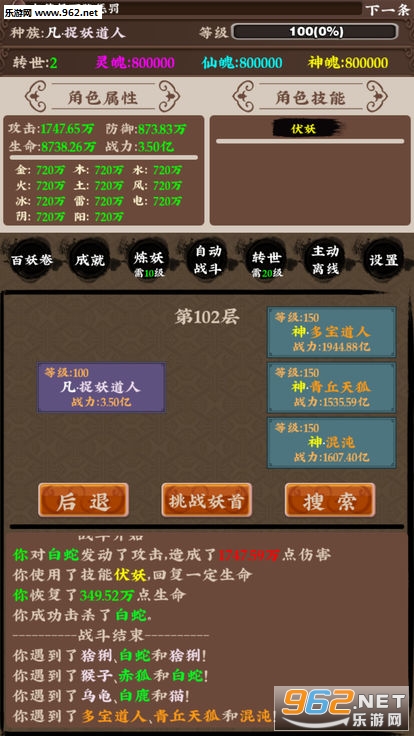 主要玩法上结合了法器修炼,角色进阶和神兽养成等多样性内容,战斗时还可以吸收战败灵兽的属性的。