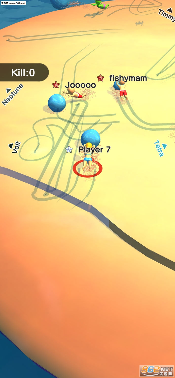 3、背景音乐听起来非常的有节奏感,把一个水球打得大一点,然后把它撞到对手身上,把他们踢出球场。
