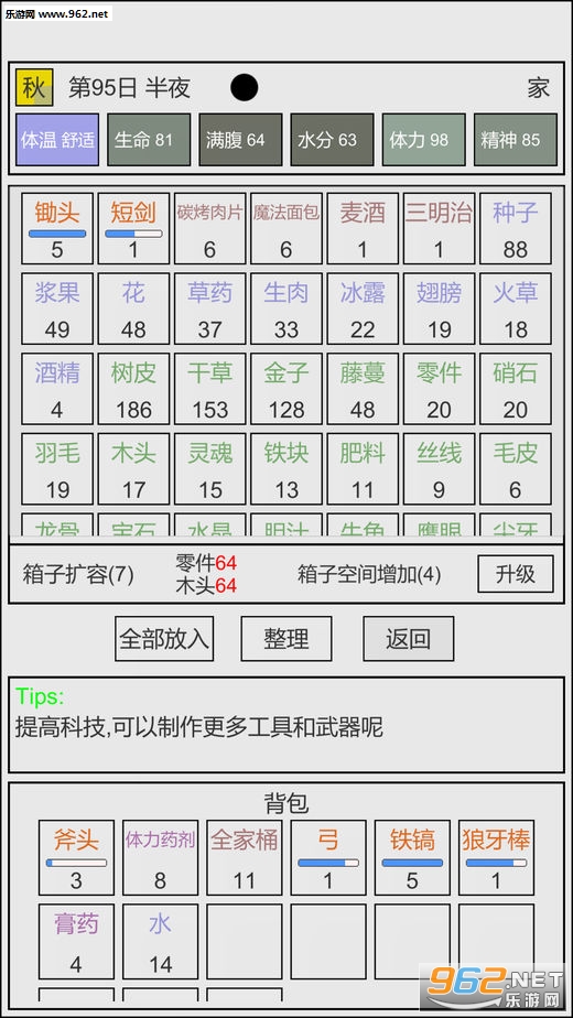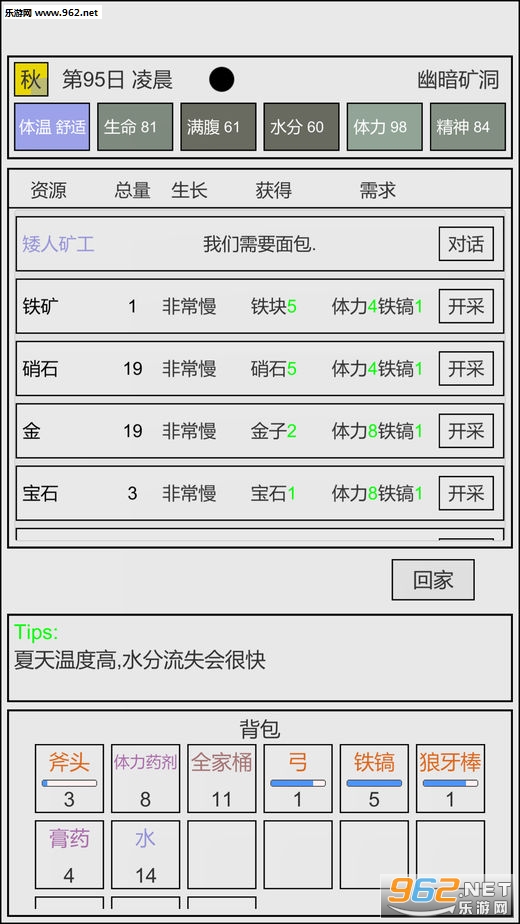 游戏开局一个营地、两个面包和一把斧头,玩家需要探索地图,获取需要的道具,并且打败最终BOSS!