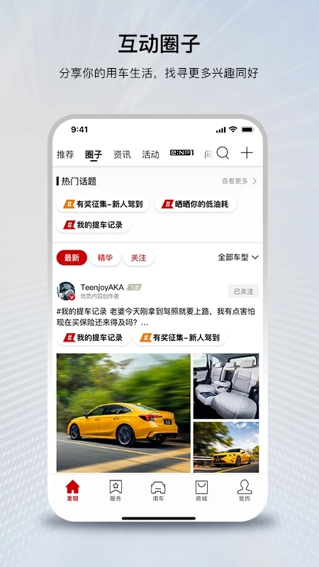 发现:丰富内容超有料!最新热门资讯,活动福利等你探索;与车友分享精彩生活