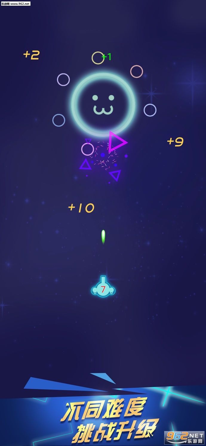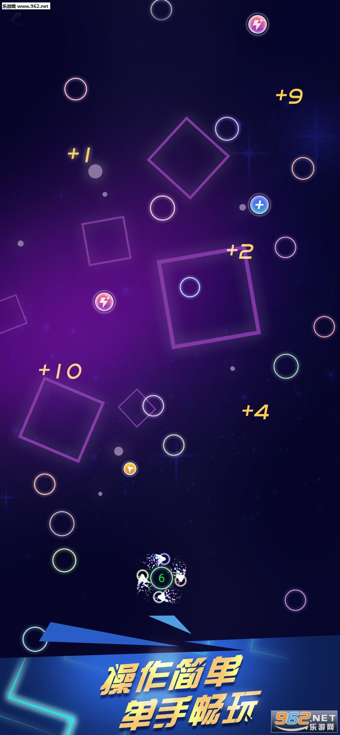 1、触摸并滑动屏幕,控制你的小圆球,躲避迎面而来的大圆环环,并且吞并比你小的。让它们围绕你旋转当吞并一定的数量之后,你就可以合成它们,帮你变的更强大。屏幕上出现的加分奖励不要错过哦,它们可以帮你获得更高分。还有的道具能帮你一次消除当前屏幕的圆圈。
