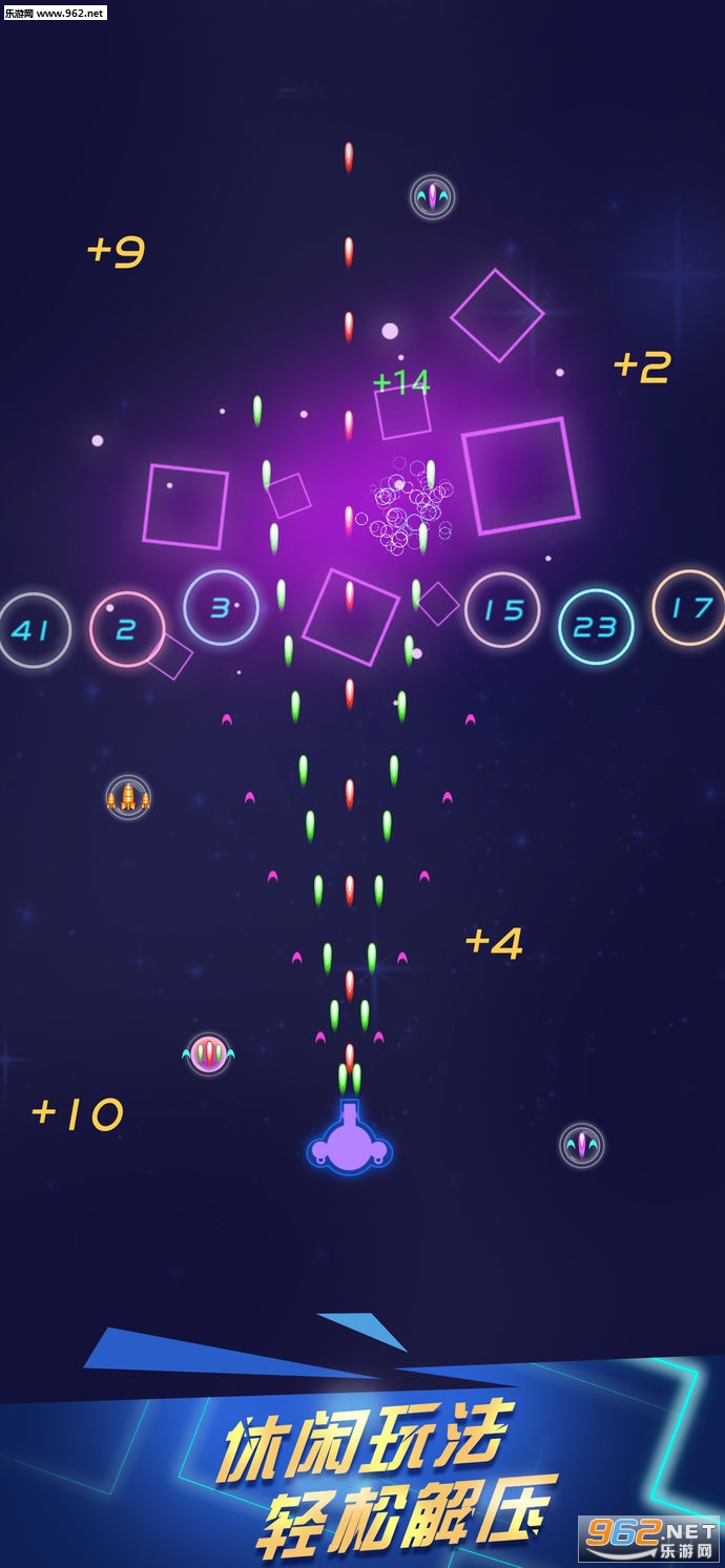 2、敌圈迎面落下,控制你的飞船射击它们,圆形圈内的数字表示它们可以承受的伤害值,当数字变成0的时候,自动消除,并有概率掉落更厉害的武器给你,注意躲避敌人飞机不时进行的随机轰炸。