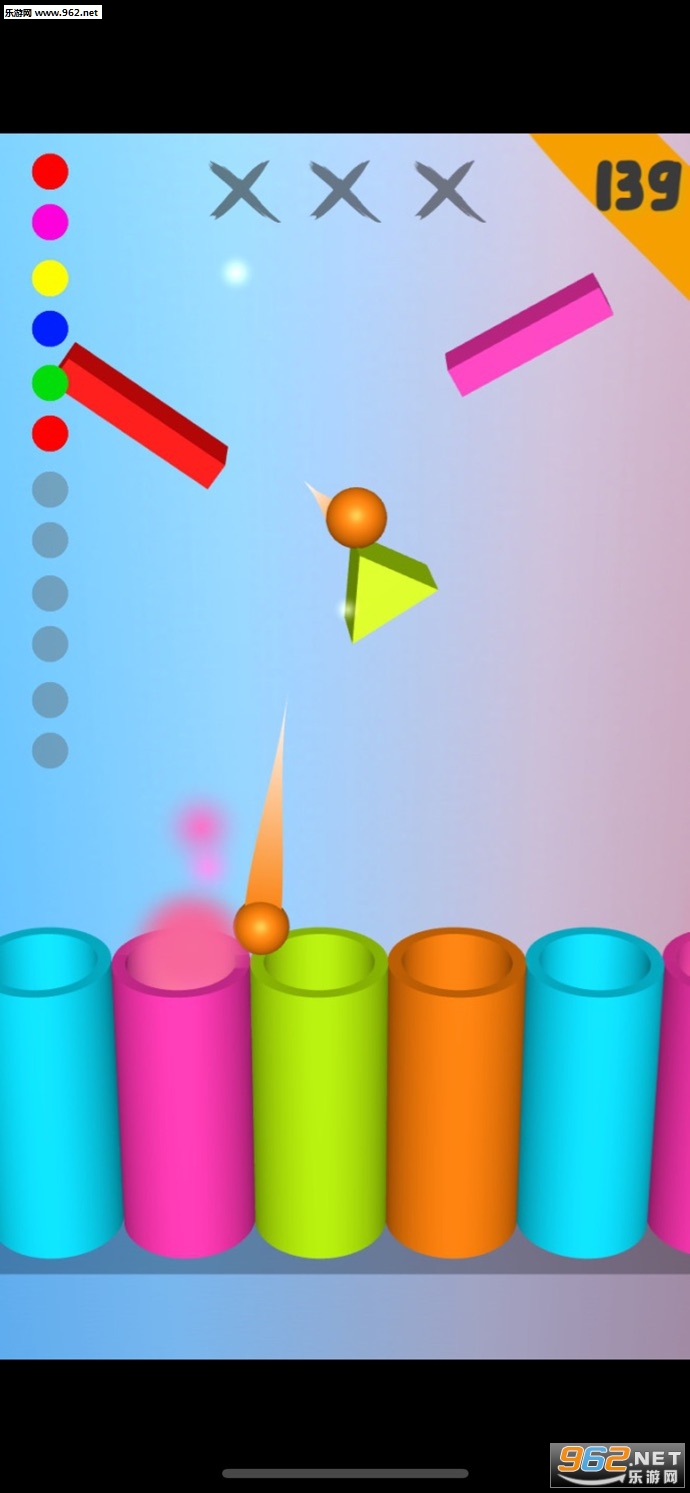 TubeColor这是一款玩法比较新颖的挑战,一片彩色的笔筒,球球要选择一个和自己颜色一模一样的油漆桶穿越过去,这个从空中飞跃过来的赛色的球球瞄准油漆桶的入口,需要一定的准度。