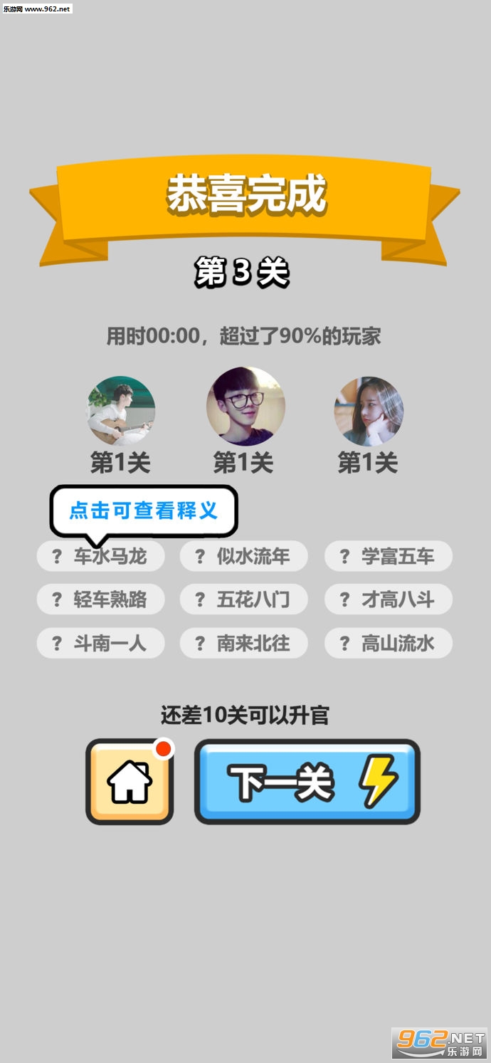 这是一款轻松好玩的成语小游戏,你将扮演一名身无分文的赶考生,通过参加成语考试,一路加官进爵,平步青云,从此改变命运,走上人生巅峰!