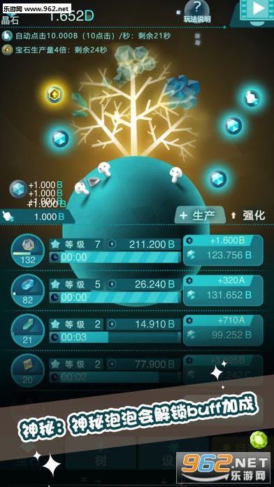 - 通过点击和收取,在神木之上培育具有神秘力量的宝石,保护并不断培育幸运树。