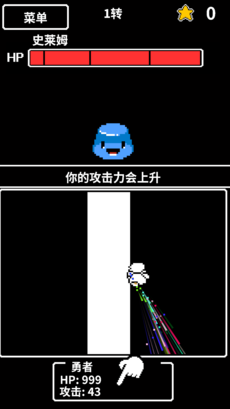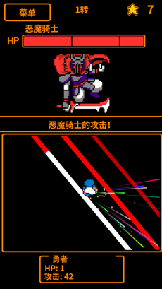 1、以躲避的方式来不断挑战各种怪物的攻势,直到提升攻击力打倒魔王为止;