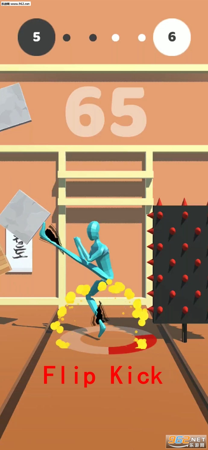Flip Kick游戏是一款非常适合用来发泄不良情绪的手机必备休闲小游戏,在这里,玩家只需要通过点击屏幕,是使人物做出各种踢腿的动作,踢走从四面八方袭来的灰尘方块,并注意不要踢到尖刺部分,否则角色会痛的直跺脚并发出痛苦的声音,整个画面看着还是蛮搞笑的,随着闯关深入,难度也会变大哦。