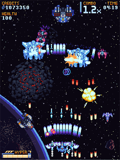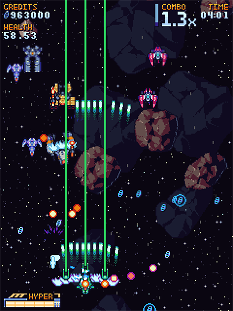 《超银河战队》是个传统的竖向飞行射击类弹幕游戏,游戏采用的经典的复古风格,目的在于唤醒特殊年龄段人群的深处记忆。本作的操作手感非常不错,有众多经典游戏的优点,玩家不需要去关注高分,尽情去享受儿时的乐趣。