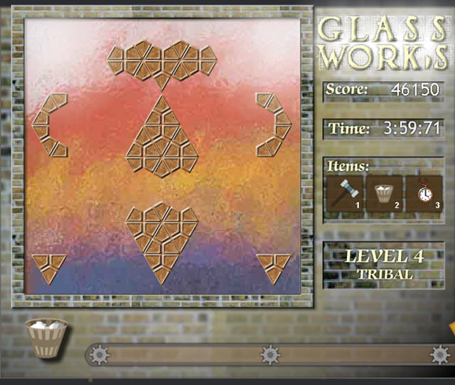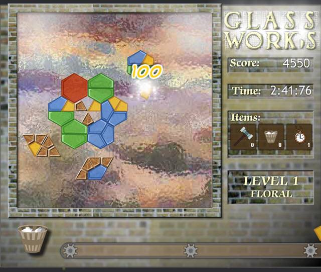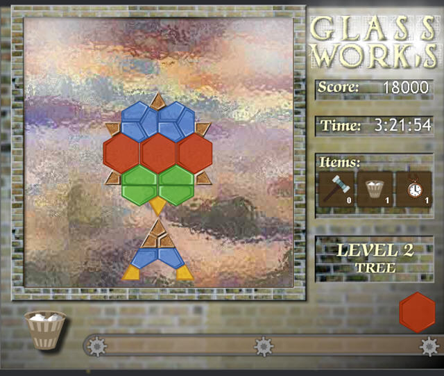 这是一款拼图游戏,玩家要利用各种不同颜色形状的玻璃来拼成游戏中的图案,如果你不需要这些玻璃,也可以顺手将他们丢入到垃圾箱中,不过会扣分哦。