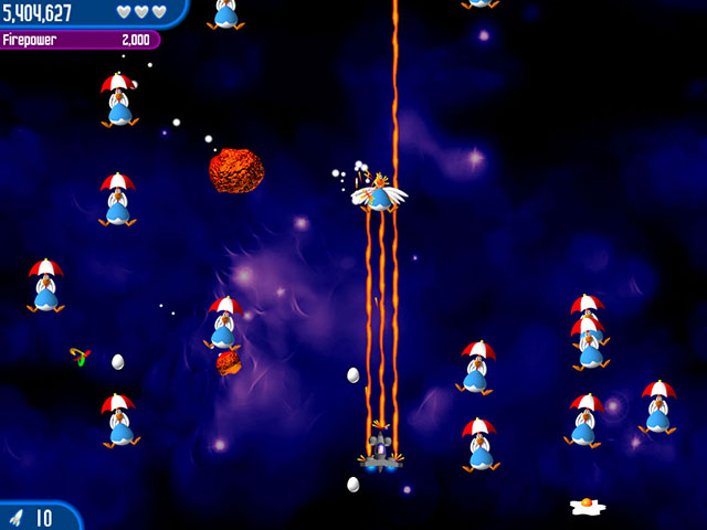 《小鸡入侵者2》有着相当有趣的故事设定,玩家需要驾驶太空战斗机去和入侵的小鸡战斗。经过3D渲染的卡通画面看起来相当可爱。游戏支持本地双人游戏,注意如果你单人玩的话不要同时点了鼠标左键和空格,不然就会两个一起出击,而且对方死了是会自动借你的生命的。战斗机的子弹主要有三种模式,需要通过拾取不同颜色的礼物来进行切换,而且还可以通过道具无限升级,不过一旦死亡一次就会掉三级,很是吃亏,所以尽量不要死亡。游戏难度还是比较低的,尤其是双人模式更加简单了。一起去和小伙伴去保卫太阳系吧,还是你想成为星系鸡餐厅菜单上的一部分呢?