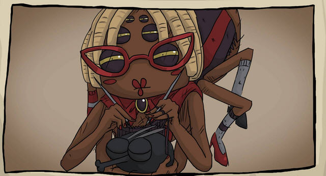 游戏的很多场景中都有一些令人忍俊不禁的镜头,玩家扮演的这只蟑螂有着4只手,而蜘蛛妈妈则在那里休闲的打着毛衣……