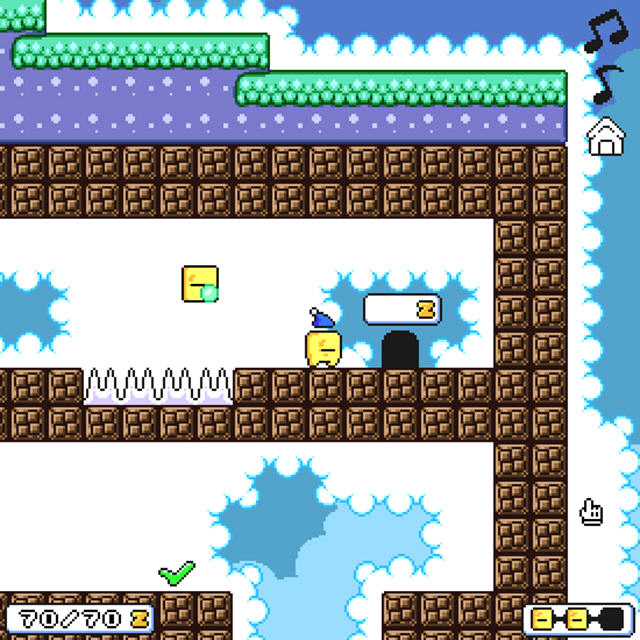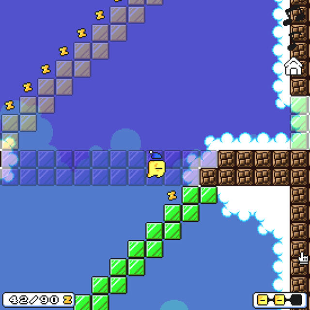游戏的主角是一个带着睡帽的小黄人,除非跳到了尖刺上面才会睁大眼睛,否则就连他的分身也是在打着瞌睡的状态,幸好他不会在空中忽然掉落下来。